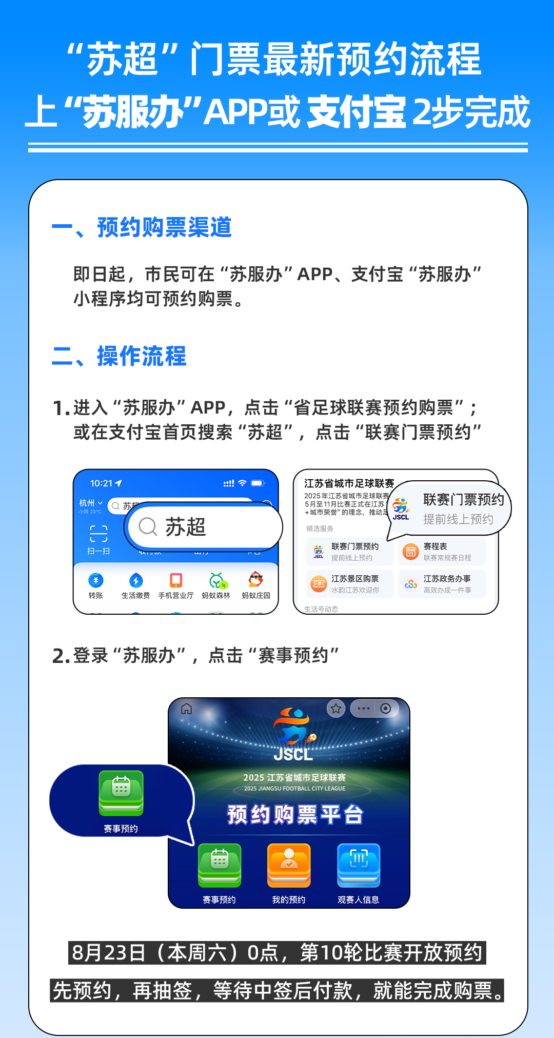 预约流程为“先预约、再抽签、后付款”。上支付宝搜索“苏超”,点击“联赛门票预约”,场次开放后即可预约。等待抽签结果,经公证处公证中签后,再前往预约平台支付门票即可完成购票。